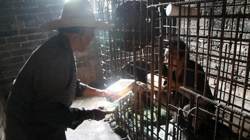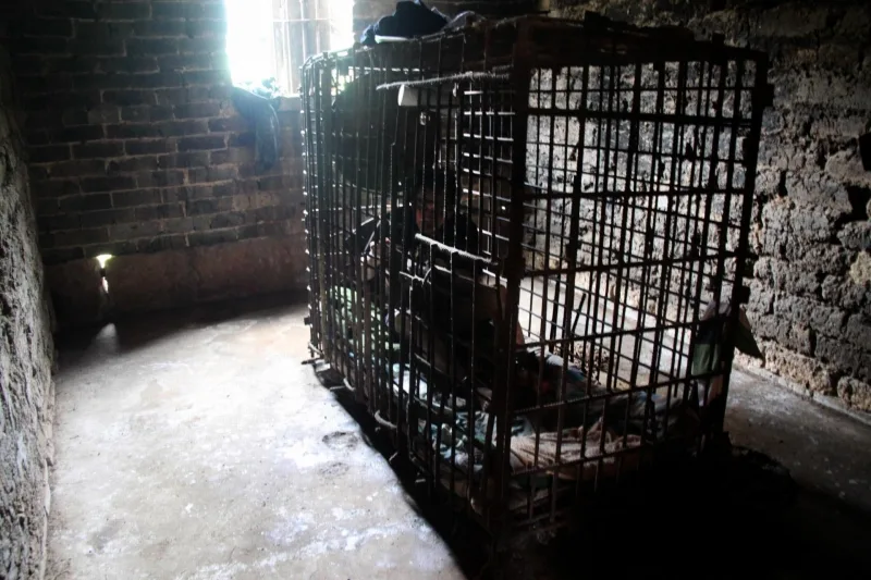 Wu was placed in shackles after his release, but his mother Wang Muxiang built the cage after he escaped and walked around his home village of Shangfan scaring local residents, the report said. Family members cried as they put him in the cage, the report added, but he escaped again and they were forced to build a stronger structure to hold him:
