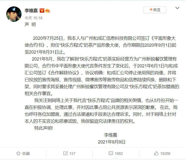 Li Weijia finally posted a response on his Weibo today. The host acknowledged he had signed an agreement to be the brand ambassador from 1st September 2020 to 31 August 2021. However, after learning that the situation had changed in May, he opted to cancel the cooperation. Li has been actively coordinating and handling matters since May. He apologised for occupying public resources and asked the franchisees to “express their reasonable demands through legal channels and means“.