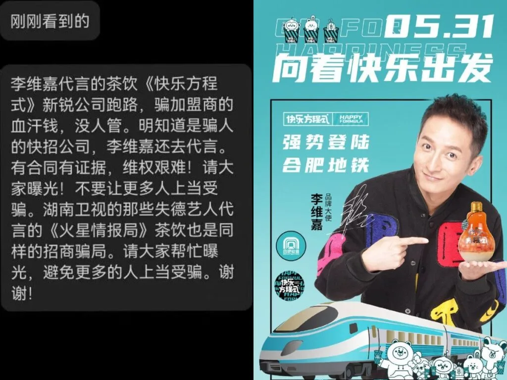 Netizens soon revealed the reason behind the scene. Apparently, Li had endorsed a certain milk tea brand called “Happy Formula” which had defrauded its franchisees. There were claims that Li knew about the other party’s deceit but continued endorsing it anyway. “Don’t be fooled anymore,” one netizen begged. They also accused the tea promoted by the talk show “Mars Intelligence Agency (火星情报局)” of being an investment scam. “Please help expose this and bring it to light,” the netizen said.
