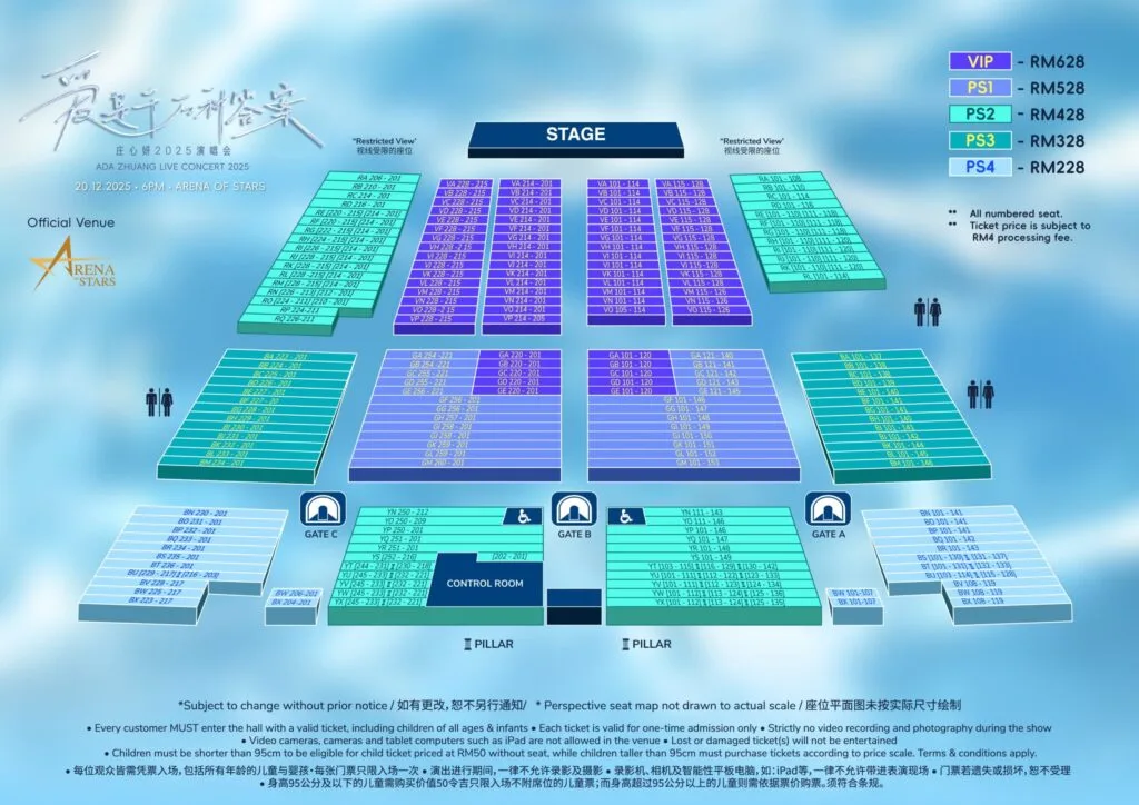 - Ticket Prices: VIP: RM628. PS1: RM528, PS2: RM428, PS3: RM328, PS4: RM228