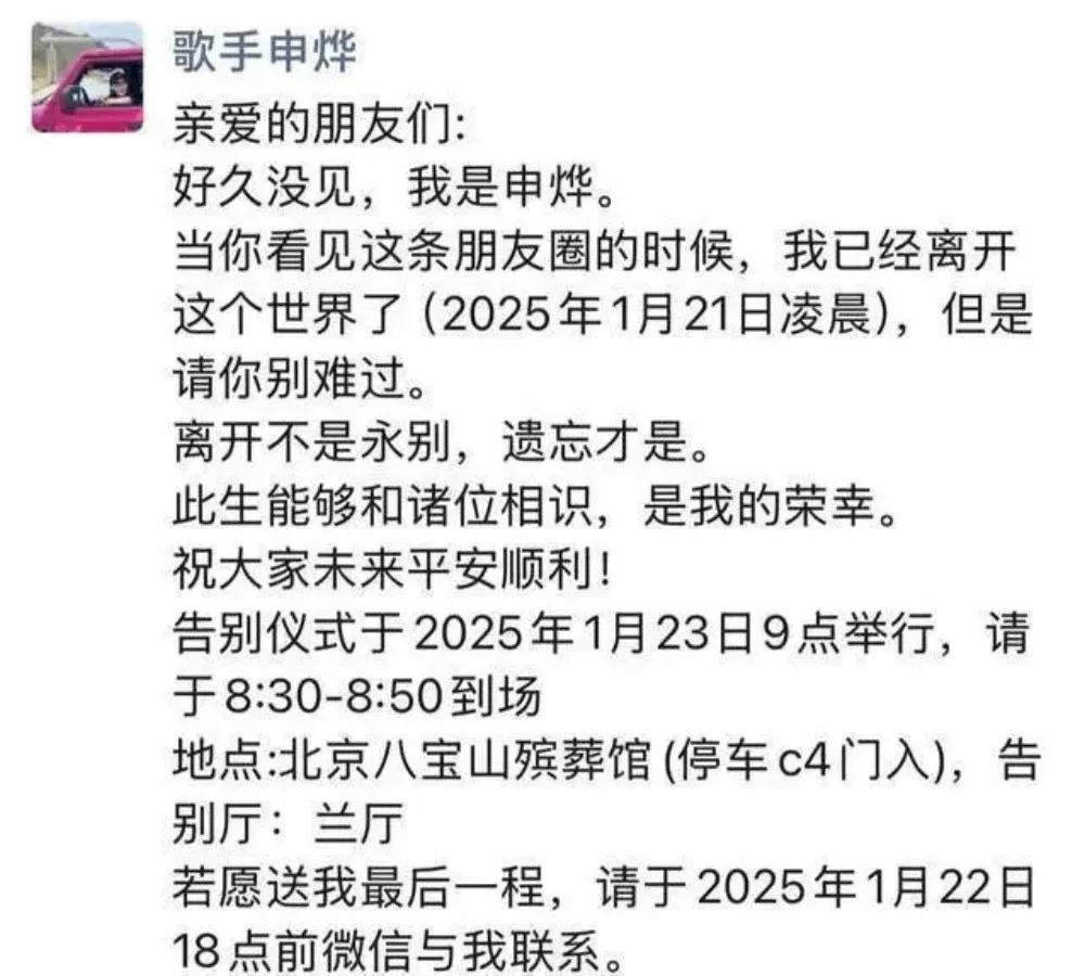 The post writes, “Dear friends, it’s been a while. It’s Shen Ye. When you see this message, I’ve already left the world (on the morning of 21st January 2025), but please don’t be sad.” Her message continues, “Leaving is not a permanent farewell; forgetting is. It’s my honour to have met you in this life. I wish everyone peace and success in the future.” The rest of the post included details about her funeral, including the date and venue.