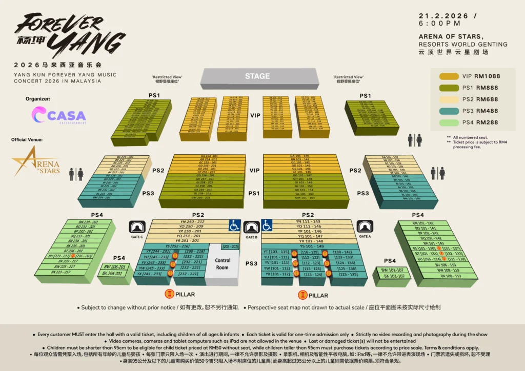 - Ticket Prices: VIP: RM1,088, PS1: RM888, PS2: RM688, PS3: RM488, PS4: RM288