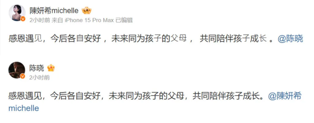Earlier today (18th February 2025, Tuesday), the two stars took to Weibo to announce their separation after eight years of marriage. Michelle and Chen Xiao posted the same message on their respective accounts, writing, “We’re grateful for meeting each other. We will remain on good terms in the future. We will parent our children together and accompany them as they grow up.” They also tagged each other on the post.