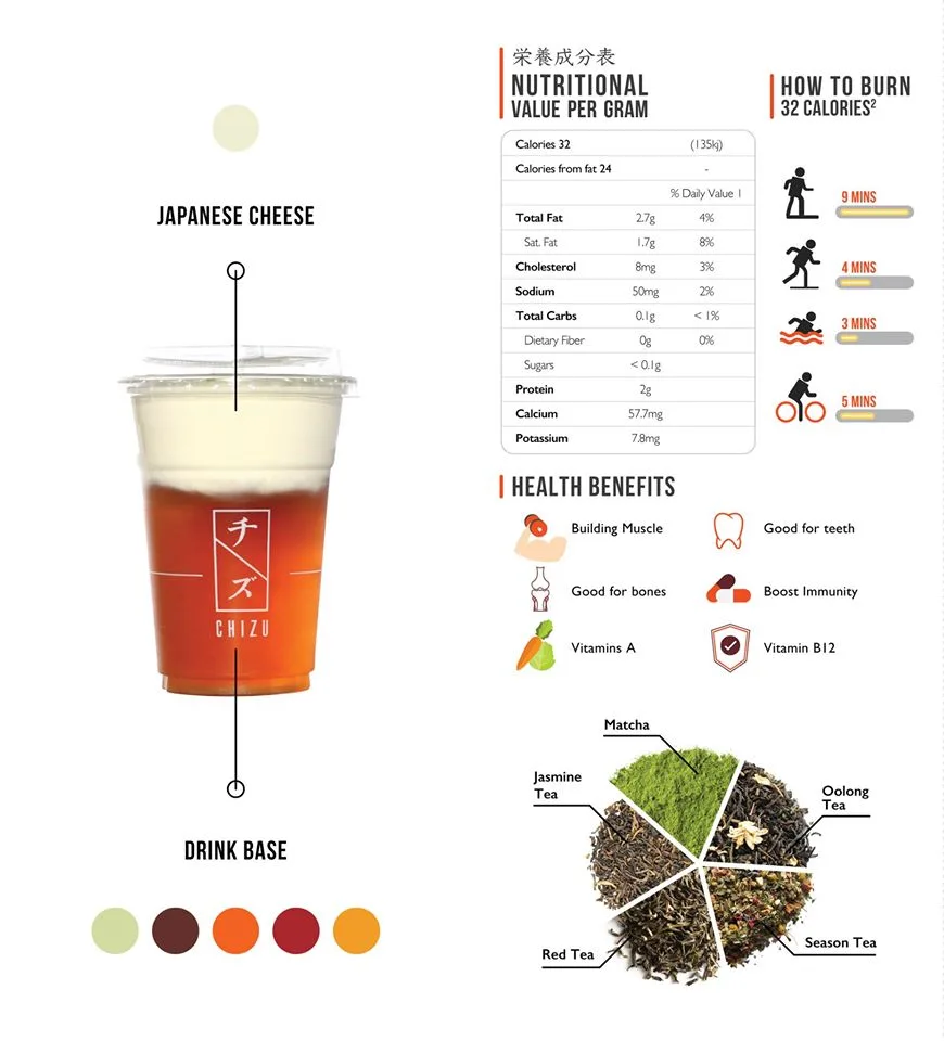 Their signature drinks include Matcha Red Bean Cheese, Blackcurrant Cheese, Season Tea Cheese, Roasted Oolong Tea, and Coffee Latte Cheese. According to the company, their nutritional drinks also have several health benefits.