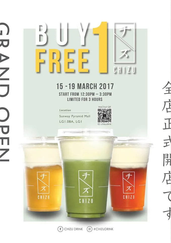 In conjunction with their grand launch, Chizu Drink is offering a Buy 1 Free 1 promotion that is valid now till this Sunday (19th March) between 12:30pm to 3:30pm.