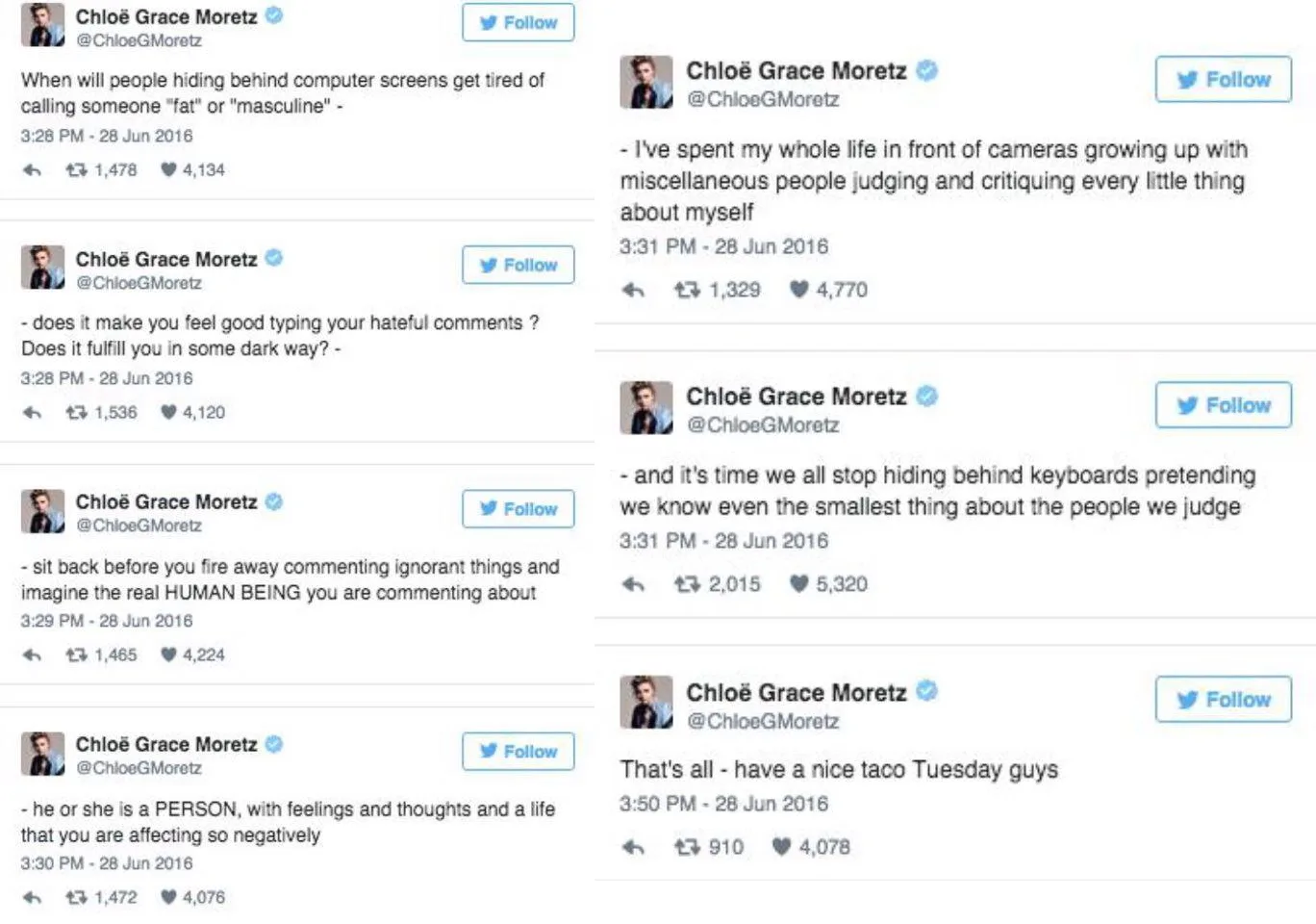 He or she is a PERSON, with feelings and thoughts and a life that you are affecting so negatively. I’ve spent my whole life in front of cameras growing up with miscellaneous people judging and critiquing every little thing about myself and it’s time we all stop hiding behind keyboards pretending we know even the smallest thing about the people we judge.