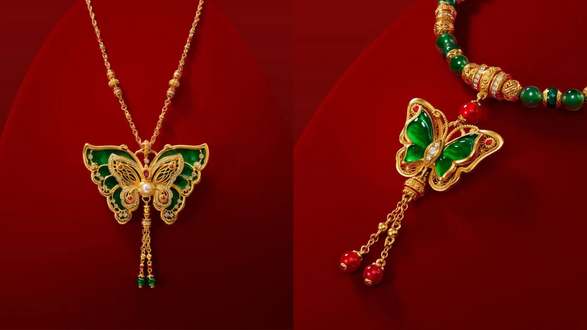 Then there’s Fudie Zhichun, a piece that feels like poetry in motion. Inspired by the Song Dynasty painting “Butterflies on Hawthorn Blossoms”, it captures the gentle flutter of wings and the freshness of spring. Made from lustrous Fei Cui (jadeite), its gold-lined wings shine softly in the light, while pearls and diamonds add a touch of morning dew, a reminder of beauty that lasts through time.