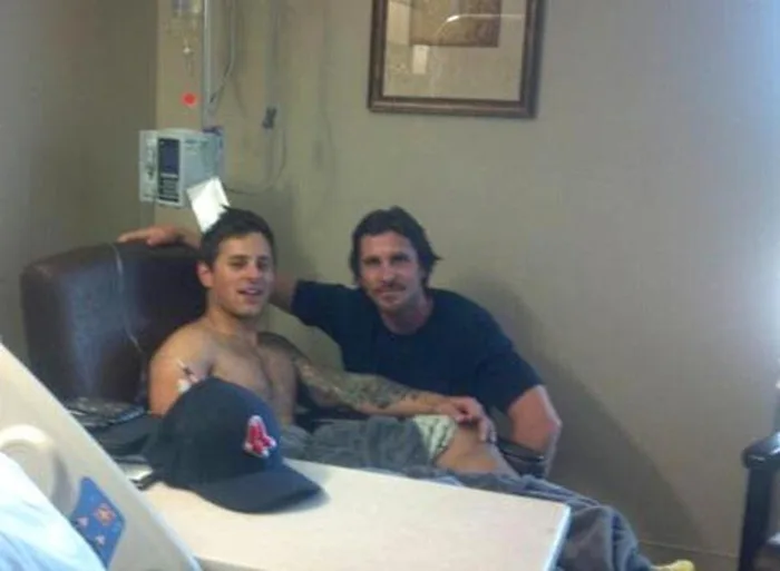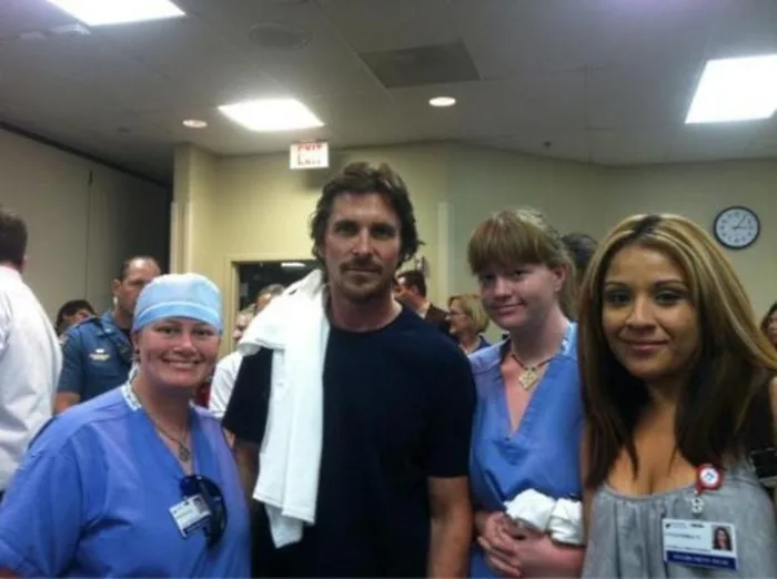 He spent about two and a half hours at the hospital, visiting five victims who were wounded in the massacre at the movie theater and two others brought in from the Swedish Medical Center nearby. One of the patients, Carey Rottman, even had a picture taken with Bale and it found its way to Twitter: