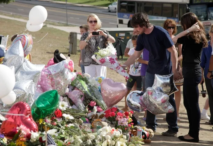 After his surprise visit, he also stopped by a makeshift memorial to the victims that’s located across the street from the movie theater, accompanied by his wife Sibi.