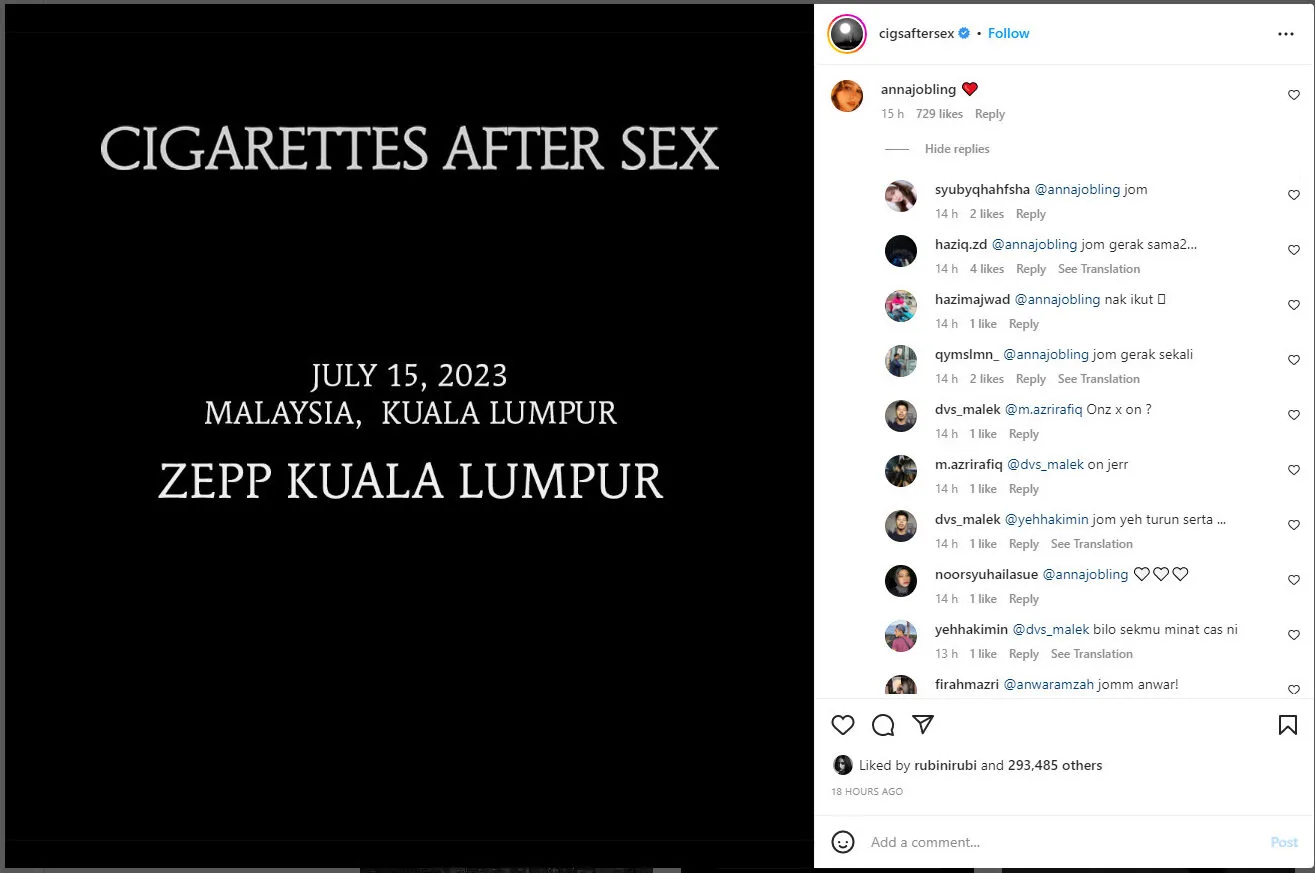 Even actress Anna Jobling is excited to see Cigarettes After Sex perform live, in person. The 22-year-old public figure left a red ❤️ emoji on the post. Many fans have commented on it, asking if they could join her for the upcoming show. There’s no doubt that the band has a huge fan base here in Malaysia.