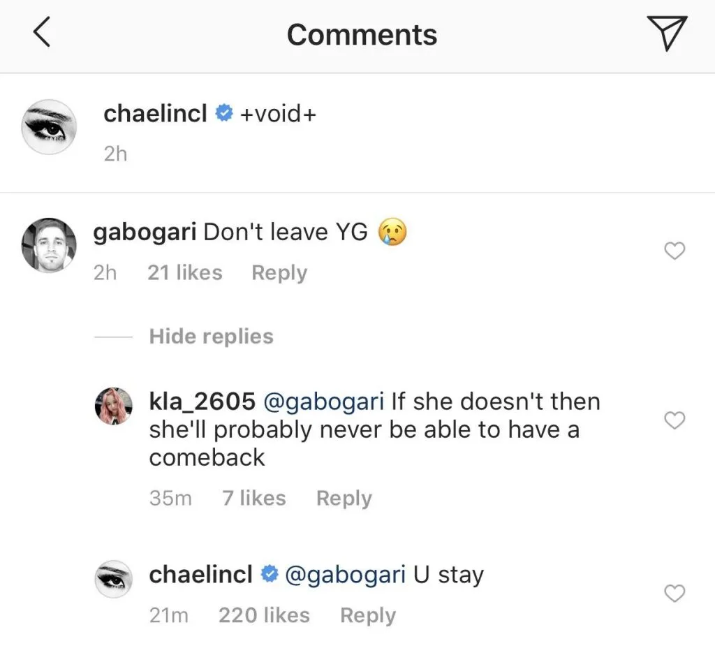 On top of that, she liked a bunch of comments supporting her leave from the company. Some comments from fans read, “Please, leave YG! You deserve better.” and “Get away while you can baby girl.”