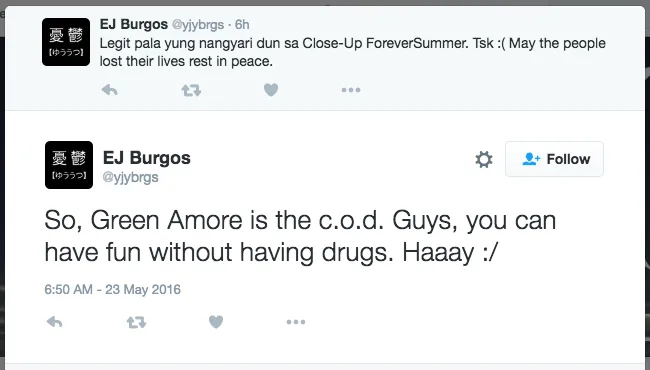 Initial reports gathered by the police suggested that the victims lost consciousness while drinking at the event, sparking suspicions that they had consumed drinks laced with an illegal substance. There are also allegations on social media that the drinks were laced with Green Amore, a dangerous cocktail of ecstacy and shabu or cialis (a drug used to treat erectile dyscuntion) also known as “fly high“, “party”, or “superman” in the local party scene.