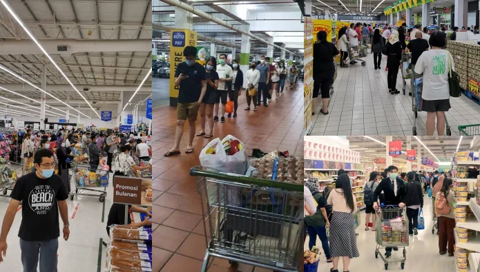 As seen by photos and videos being shared online, there are long queues at various malls and supermarkets – all rushing to stock up on necessities and food. Here are some examples: