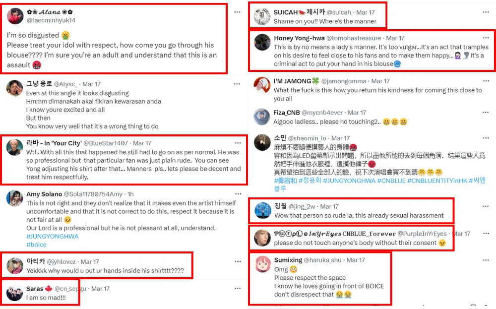 The footage of the incident was shared on social media, leading to a ton of criticism towards those who inappropriately touched the singer. Many deemed the action a blatant act of sexual harassment, saying the fan should be ashamed for their behaviour. Others lament that fans crossed the line and took advantage of Yonghwa’s kindness after he voluntarily moved closer towards the crowd during the performance.