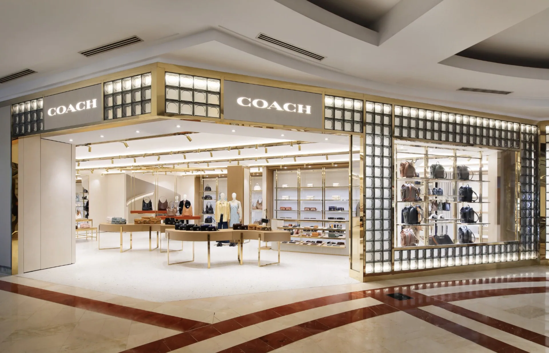 Even so, the space retains key elements of the brand’s code, including Coach’s signature glass block, barrel vault ceiling and terrazzo floor. The open, airy feel of the space welcomes customers into a luxurious shopping experience complete with: