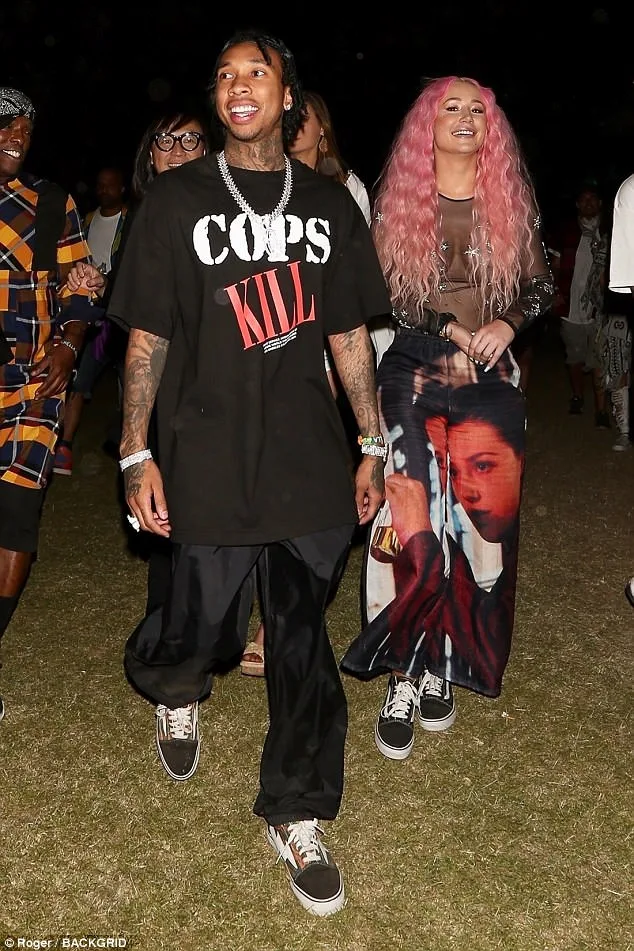 During the recent music festival, the pair rocked matching Vans shoes. Eggy Eggs wore a revealing sheer black longsleeve top where the only thing covering her modesty was her bright pink hair. Meanwhile, the American rapper wore a political statement tee with the words “Cops Kill”.