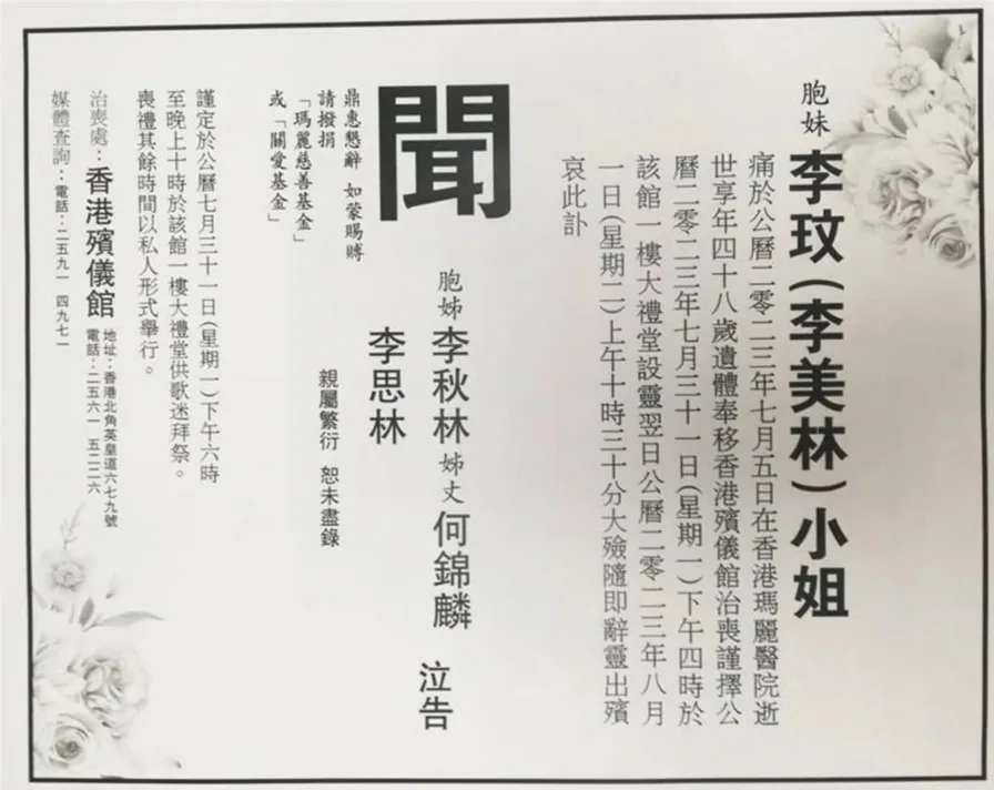 The obituary also mentioned that condolence money would not be accepted and requested such funds be donated to The Queen Mary Hospital Charitable Trust and the Community Care Fund (关爱基金). They explained that this was to honour Coco Lee’s spirit of charity which she had demonstrated during her lifetime.