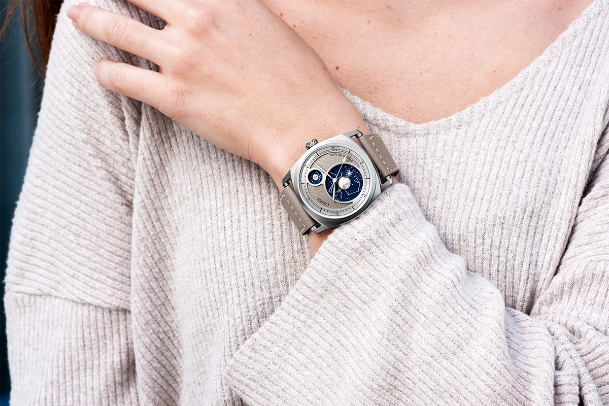 The moon and date circles form an 8 – the symbol of infinity -, the grained background of the dial recalls the lunar surface, while the intertwined rings evoke its craters. The convex sapphire crystals provide the retro-classical touch that brings the whole thing together.
