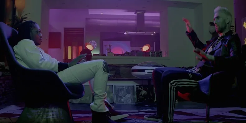 It all begins when Levine reluctantly agrees to attend Future‘s crib for a listening party. However, his night takes a turn for the weirder when his drink is dosed with acid. From there, everything starts to turn trippy as walls go wobbly, police cars start to float above ground and human head’s turn into animal skulls.