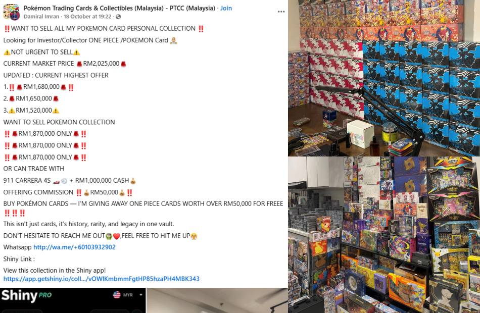 According to his Shiny account, his entire collection is worth over RM2 million but he’s not looking to sell all of it. As seen in the screenshot above, the young collector is currently looking to sell his Pokémon card collection for RM1,870,000, with the highest offer standing at RM1,680,000 at the time of writing.