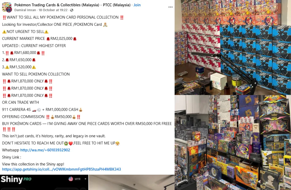 According to his Shiny account, his entire collection is worth over RM2 million but he’s not looking to sell all of it. As seen in the screenshot above, the young collector is currently looking to sell his Pokémon card collection for RM1,870,000, with the highest offer standing at RM1,680,000 at the time of writing.