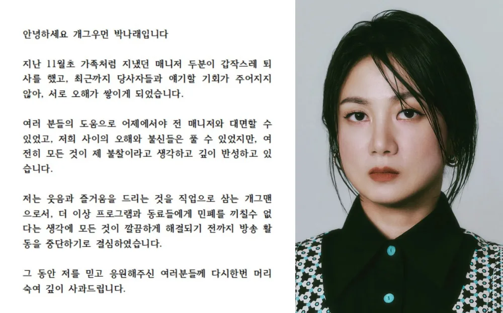 Recently, the comedian faced criticism over allegations of manager abuse by two former managers, leading to a lawsuit against her. The two unnamed individuals accuse Park Narae of workplace bullying, assault and non-payment of work-related expenses. According to the managers, the television personality would subject them to personal mistreatment and even forced one of them to drink against their will.