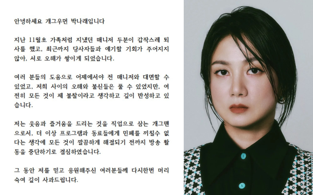 Following her recent controversies, Park Narae announced that she will temporarily suspend her broadcasting activities until she resolves the issues. However, she noted that she had met with her former managers to clear misunderstandings. The 40-year-old ended her post with an apology to the public for the recent issues. The production team for “I Live Alone” later confirmed that Park Narae won’t appear on their show until further notice.