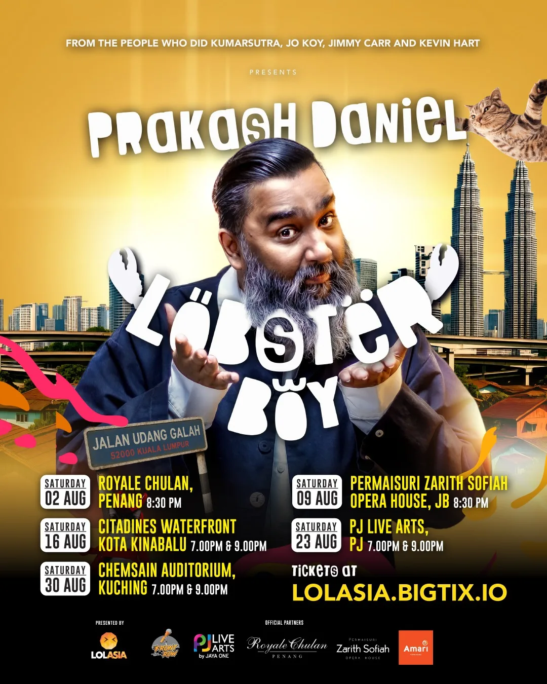 After captivating audiences across Australia, Malaysia’s very own “bearded funny man,” Prakash Daniel, is set to bring his highly anticipated solo show, “Lobster Boy”, back to his home turf. Presented by LOL Asia, this multi-city Malaysian tour promises to deliver the same signature blend of street-smart humour, 90s nostalgia, and heartwarming storytelling that has resonated with international audiences.