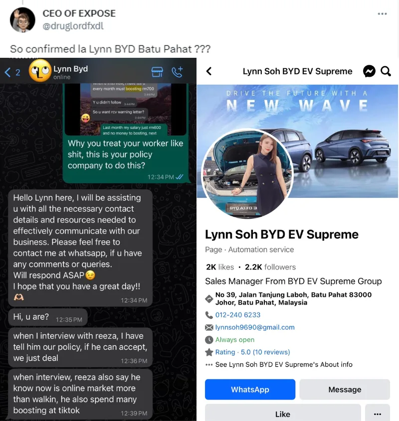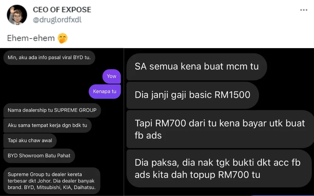 After the initial Twitter thread went viral, another Twitter account, @/druglordfxdl, shared more information about the dealership from someone who claimed to have worked there. According to the messages, the dealership in question is the BYD Showroom, managed by Supreme Group, the largest car dealer in Batu Pahat, Johor.