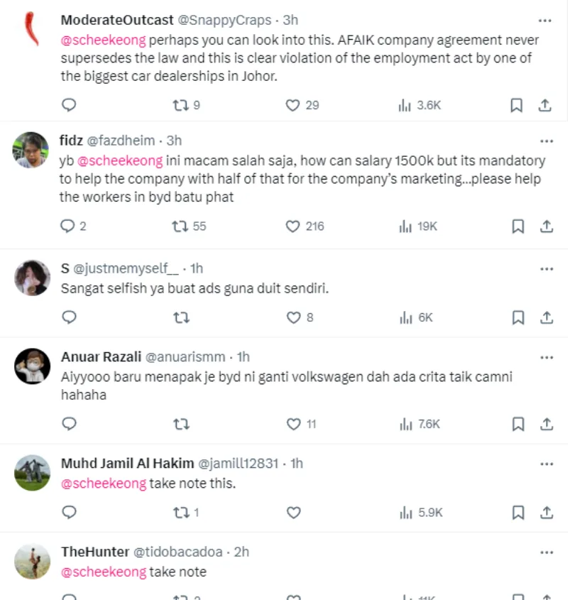 In another tweet, the user shared a conversation with the BYD Showroom sales manager, Lynn Soh. The sales manager argued that the employee, believed to be named Reeza, was aware of the company policy of paying RM700 out of pocket for Facebook advertising. However, netizens were still unhappy with the argument, saying the dealership was still in the wrong for forcing an unfair policy onto its employees. Many even tagged the Minister of Human Resources of Malaysia, Steven Sim, to investigate the dealership for potentially violating labour laws.
