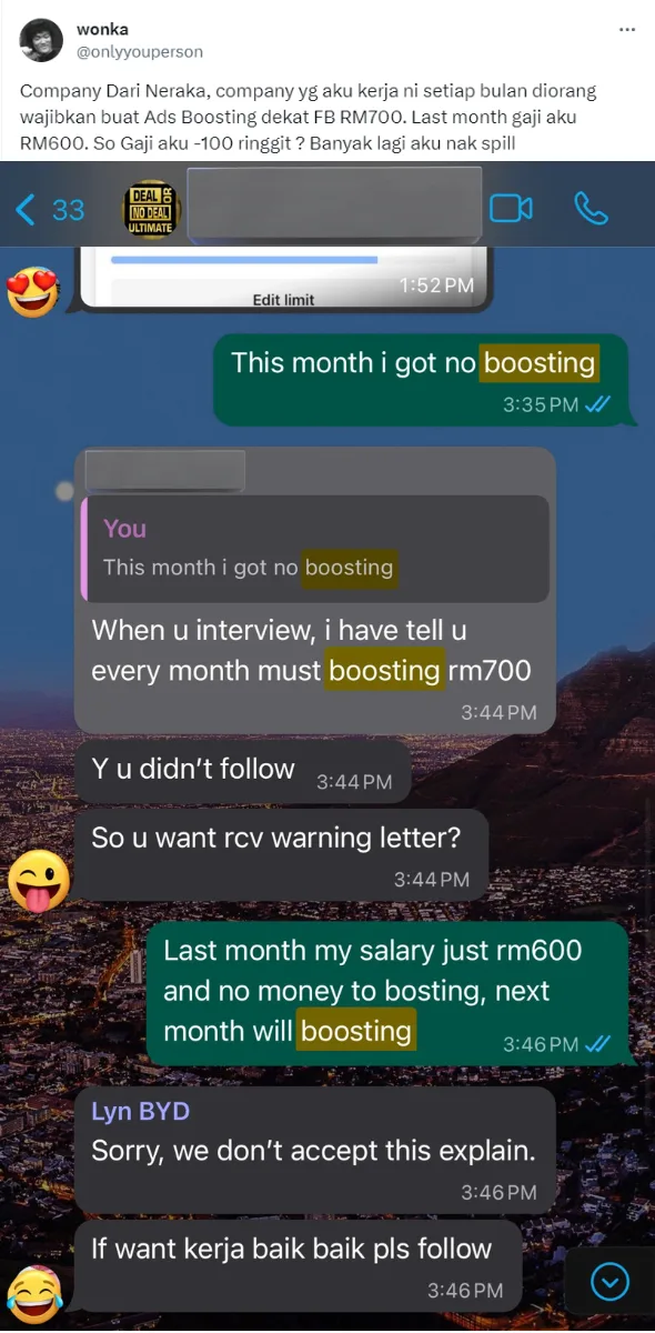 According to Twitter user @/onlyyouperson, the company he works for requires him to pay RM700 for ad boosting on Facebook using his own money. The tweet also included a screenshot of a conversation between the employee and his employer regarding the boosting.