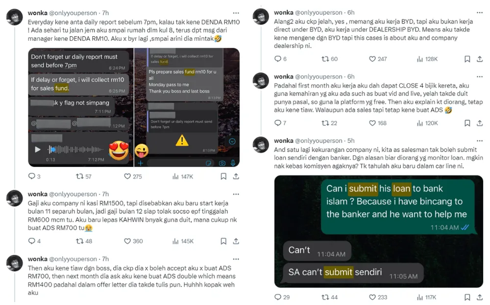 The employee added that the boosting was still mandatory even though he had sold four units that month. He also revealed that the boss forced him to set up double the number of ads on Facebook the next month, which meant he would have to fork out RM1,400. In addition to being forced to pay for Facebook ads, the sales associate claimed that the dealership would also fine employees RM10 if they failed to send their daily reports before 7pm. He added that the sales associates can’t directly submit their clients’ loans to the bank, per company policy.