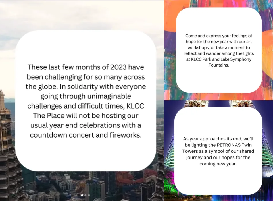 While it was not explicitly mentioned, it’s possible that the statement above was referring to the simultaneous genocide in Palestine, Congo and Sudan. However, it does not mean that there won’t be any kind of light show to bring in the New Year. KLCC also wrote that they encourage visitors to gather at Lake Symphony Fountains as they will be lighting the Petronas Twin Towers at midnight as a “symbol of our shared journey and our hopes for the coming new year”.