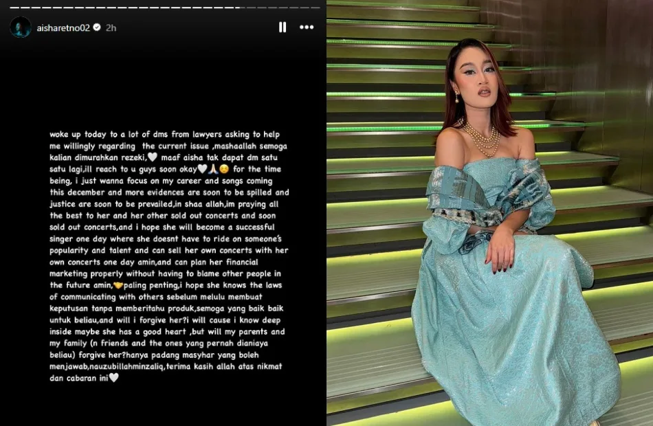 Meanwhile, Kharisma Music founder Yuka Kharisma demanded that Aisha pay back the money she owed the organiser. It was revealed that the purpose of the concert was to serve as collateral for the singer to repay a sum of RM83,000 that was loaned to her for the song “Sutera” and her performance at the Anugerah Juara Lagu 38 (AJL38) last March. “Back in January, ARE expressed difficulty in finding funds for Aisha’s AJL performance and requested assistance from KM. We’ve loaned her RM83k and so far, she has only paid RM6k leaving a remaining RM77k,” she said.