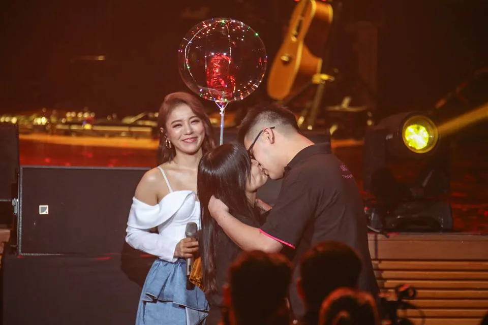 One loyal female fan named Amy Ang took the mic to publicly declare her love to her boyfriend, David Ooi. Throughout their 8-year relationship, Amy told everyone in the venue that her beau would faithfully take her to every Della activity in town. Despite her trembling voice, she shocked the audience when she announced that she was going to proposed to her lover.