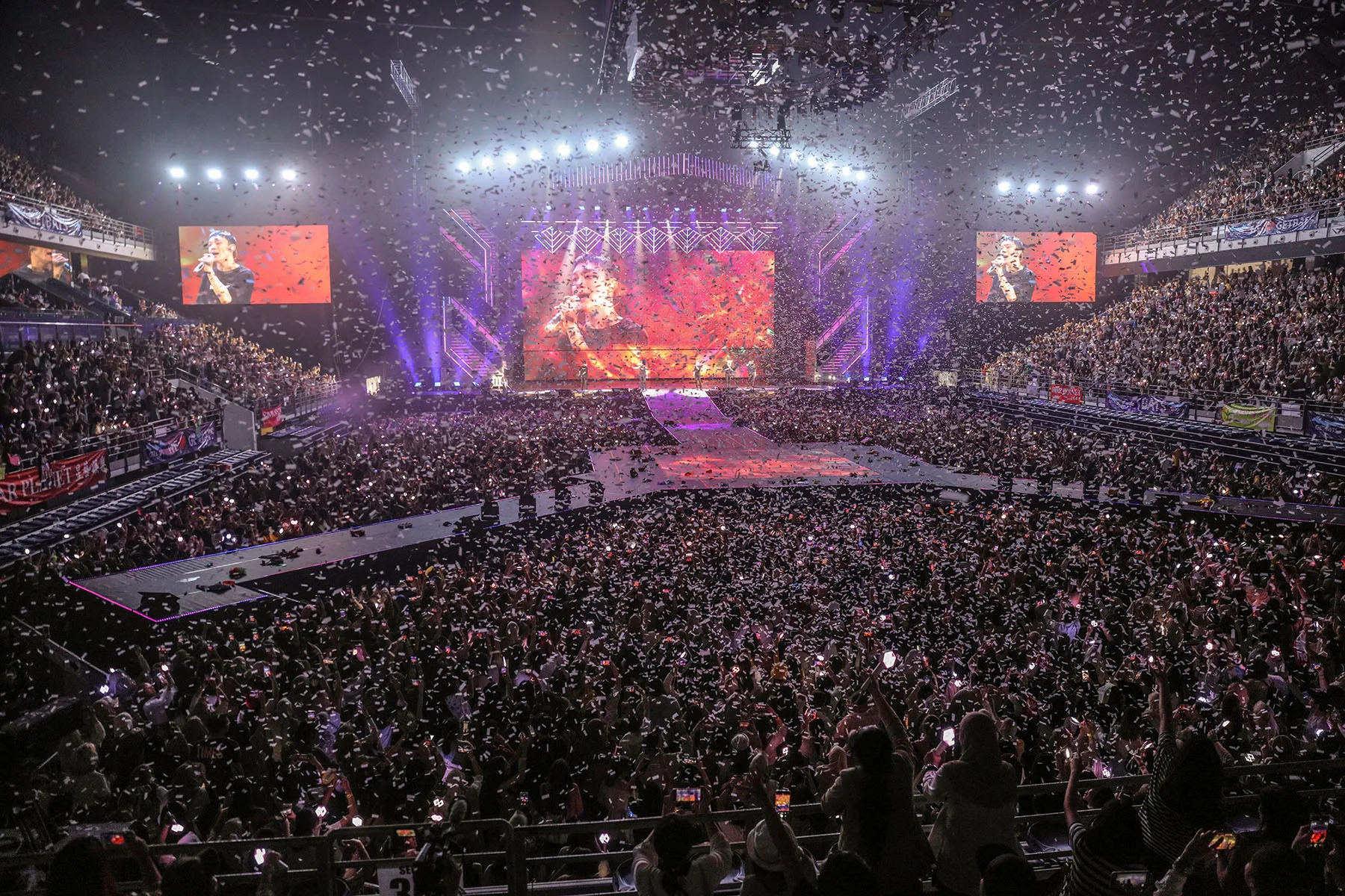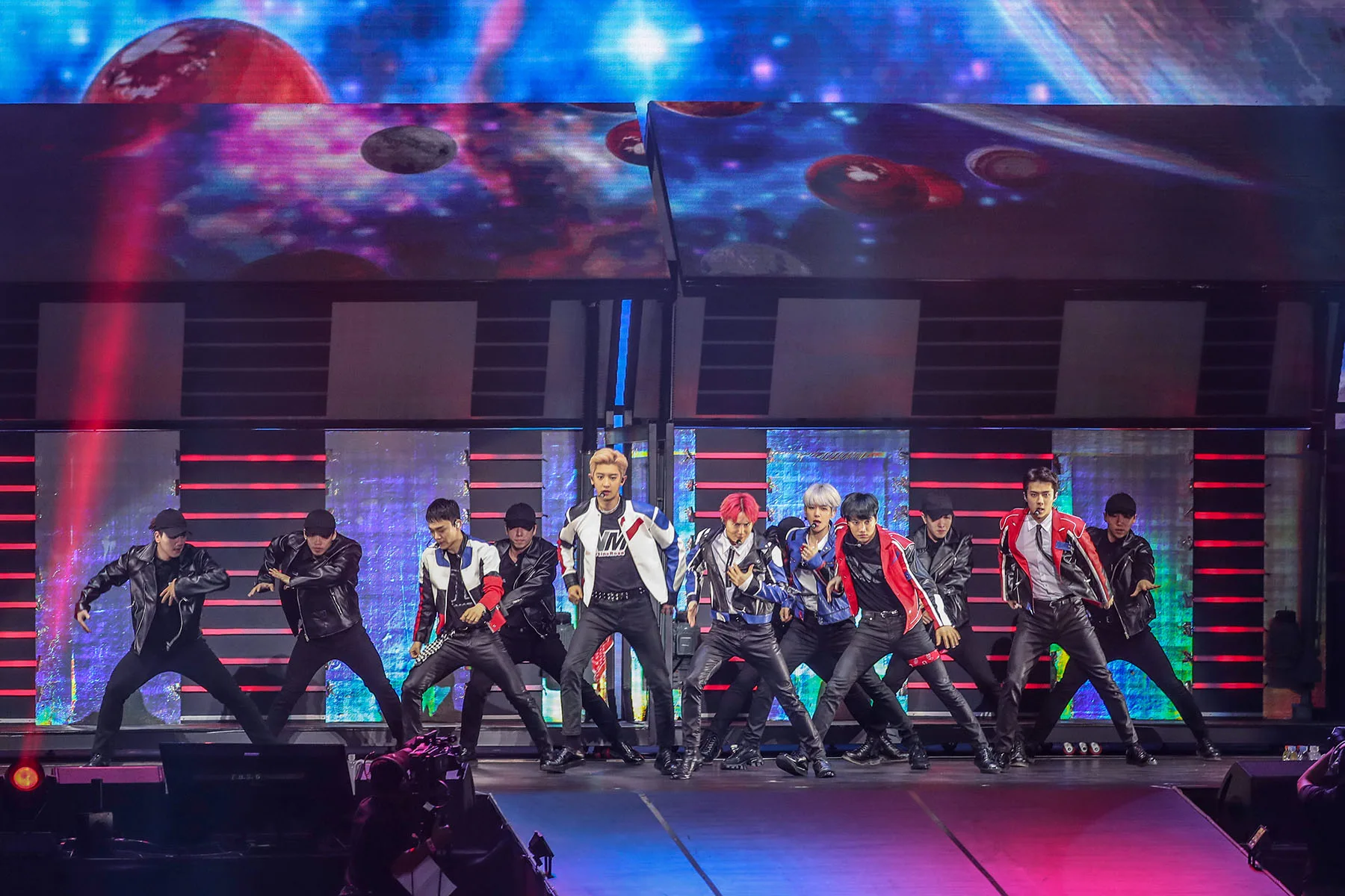 Entering Axiata had a different air to it. It was partially due to the awful weather, which had fans scurrying for cover from the pelts of rain in the form of a flimsy poncho or an empty tent. It was also thick with excitement; cheers and chants louder than anything we’ve heard before. As the ferocious chants of “E, X, O, ” rang through the stadium, it was clear that this was the impact of South Korea’s most prized boy group. What were previously white light-sticks clad by fans were now changing colours, synching with the bombastic VCR playing on the many screens in the arena. As flashy red cars revved up on the big screen, the entire stadium turned into a similar crimson shade.