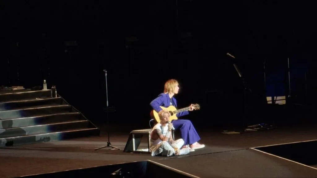 Following all the adrenaline-rushing excitement, it was time to dial it down. Ryota and Tomoya exited the stage for a short while, giving the floor to Taka and Toru to perform the perfect song for the couples in the crowd, “Your Tears Are Mine”. The duo invited everyone to sing along as the lyrics were projected on screen to help those who weren’t overly familiar with the song. The audience lit up in the arena with their phone’s flashing lights like a sea of stars.