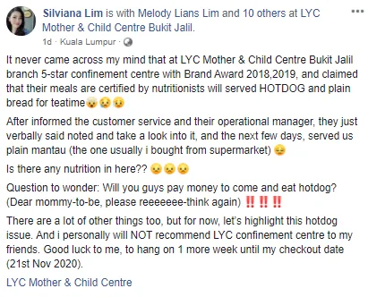 A customer at the LYC Mother & Child Centre Bukit Jalil branch didn’t take it lightly when she was served hotdogs and plain bread, even though the place claimed that their meals are certified by nutritionists. Not long after, she went out of her way to make a public post on her Facebook page, stating her complaints against the award-winning confinement centre.