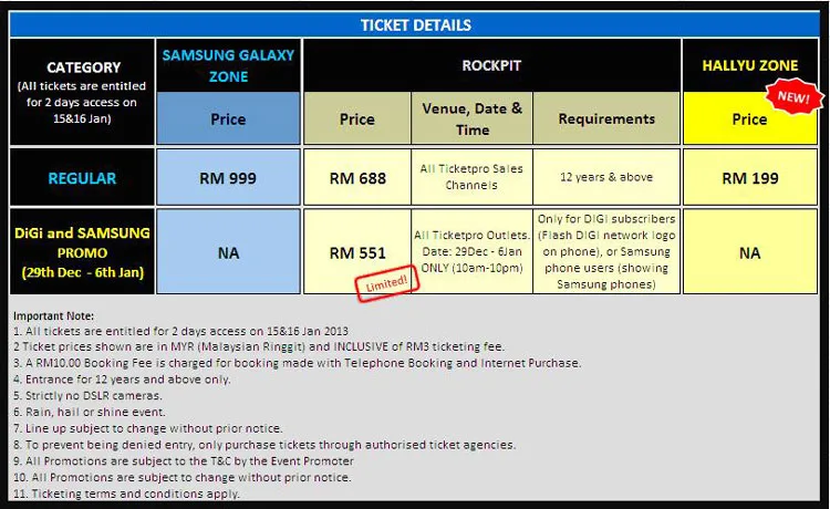 Tickets to the event are available in three tiers, priced at RM999, RM688, and RM199, and all three tiers will be for access over 15th and 16th January 2013.