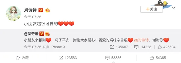 Wu announced the news on his Weibo account, “Our little friend has reported for duty, Mother and son are both safe and sound, thank you everyone for your concern!” while Liu responded, “Our little friend is super cute.”