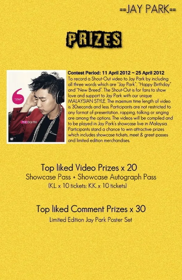 - Post a video of your creative Malaysian style shout-out to Jay Park by including all three words “Jay Park”, “Happy Birthday”, and “New Breed” with a maximum length of 30 seconds. Participating individuals must be present in the video.