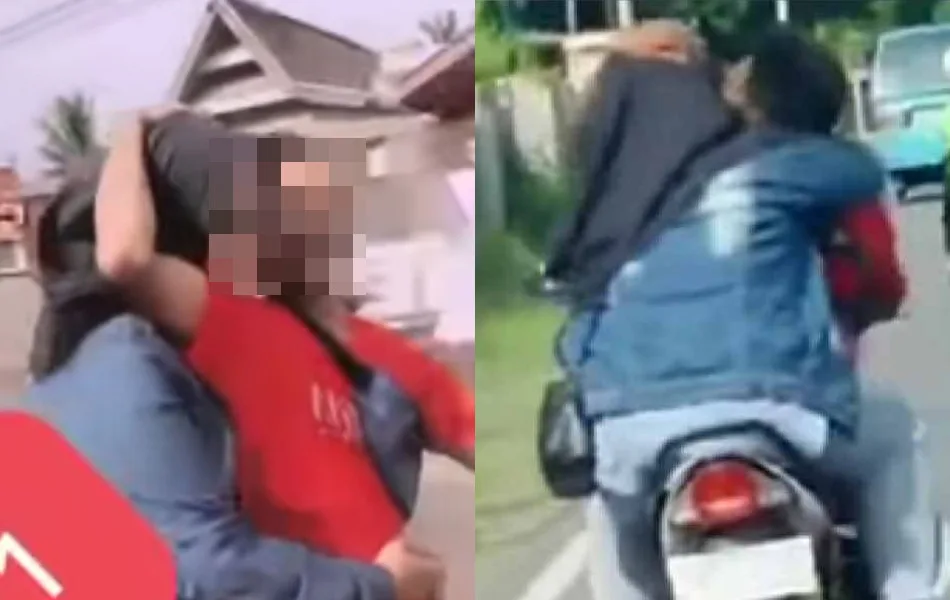 According to reports, the incident took place in the Bulukumba Regency in South Sulawesi, Indonesia. The man in the video could be seen placing his left hand on the his GF’s head (who’s also spotted hugging her beau from the back), while turning his head slightly backwards several times to give her a kiss.