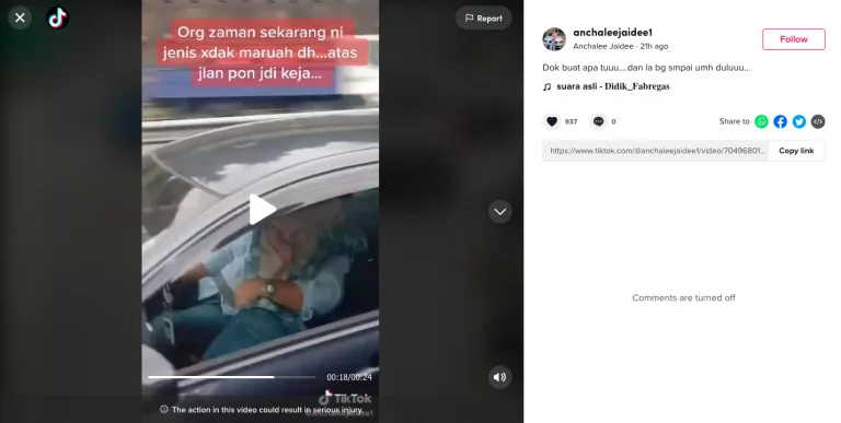 In the video, shared by TikTok user @anchaleejaidee1, a woman was seen sitting on the driver’s lap. But the spotlight, though, was on the female netizen’s caption. She apparently called the couple out, saying, “People these days don’t have dignity anymore. Even on the road, they’re still ‘on the job’. What are you guys doing? Keep it in your pants until you arrive home.”