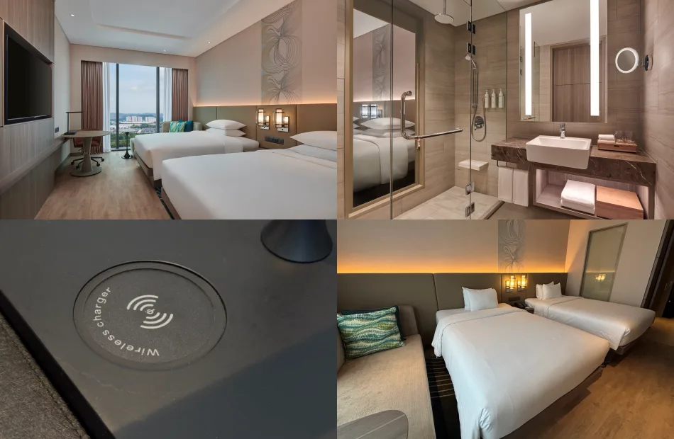 We checked into a charming Deluxe Double Guestroom on the 22nd floor, which features two double beds and a sofa in a 30 sqm space. If you’re travelling as a group of three, you’ll be pleased to know the sofa is equally comfortable and spacious enough to sleep on. The first few things we noticed about the room were the wireless internet (a must-have, of course), a desk lamp with a built-in wireless phone charger, and a coffee and tea-making station. The beds were exceptionally cosy — perfect for a quick nap or a full night’s rest after a long drive.
