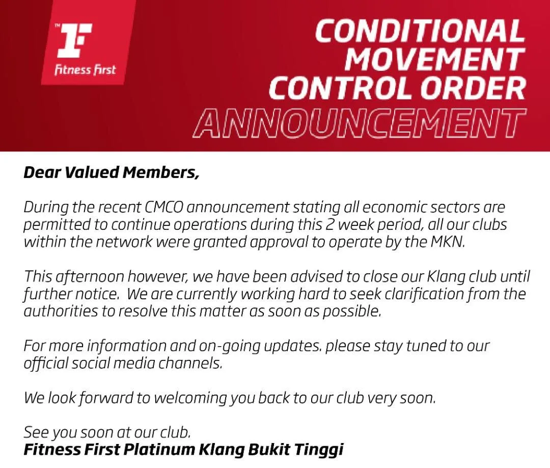 Yesterday, Fitness First Malaysia issued a notice informing patrons that a gym member who exercised at Fitness First Platinum gym located inside Aeon Bukit Tinggi, Klang had tested positive for Covid-19.