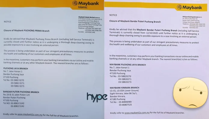 The new cases comes courtesy of Malaysiakini, stating that Maybank Puchong Prima as well as Maybank Bandar Puteri Puchong are now temporarily closed.