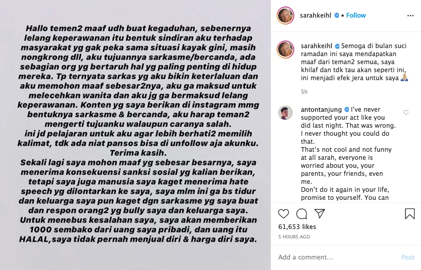 Realising that her “prank” post was rather immature, Sarah gave a lengthy apology for making fun of the situation.