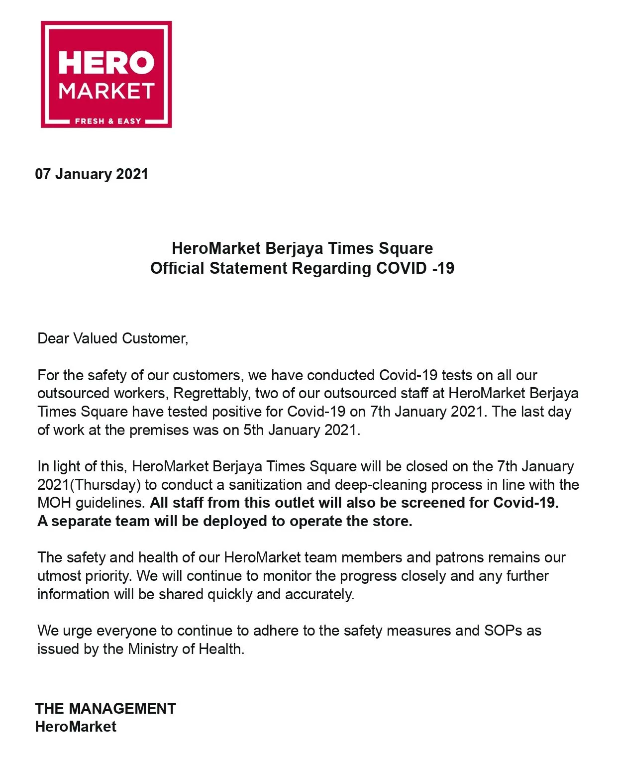 Elsewhere at Berjaya Times Square, HeroMarket confirmed that 2 of their outsourced staffs have tested positive for Covid-19. They last reported to work on Tuesday (5th January). “All staff from this outlet will also be screened for Covid-19. A separate team will be deployed to operate the store,” the management informed.