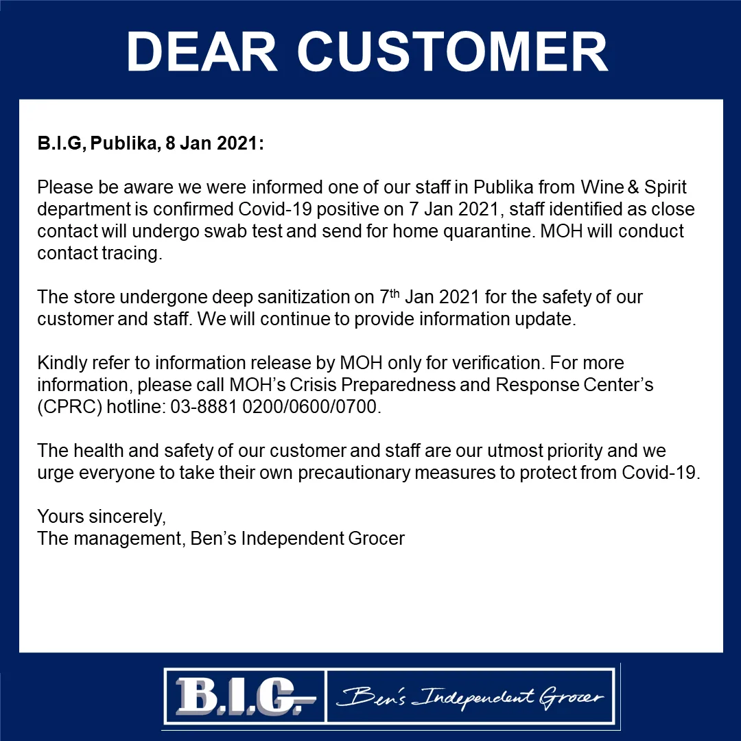 “Please be aware we were informed that one of our staff in Publika from the Wine and Spirit department is confirmed Covid-19 positive on January 7, staff identified as close contact will undergo swab test and send for home quarantine. MoH will conduct contact tracing,” the company said in a statement today.