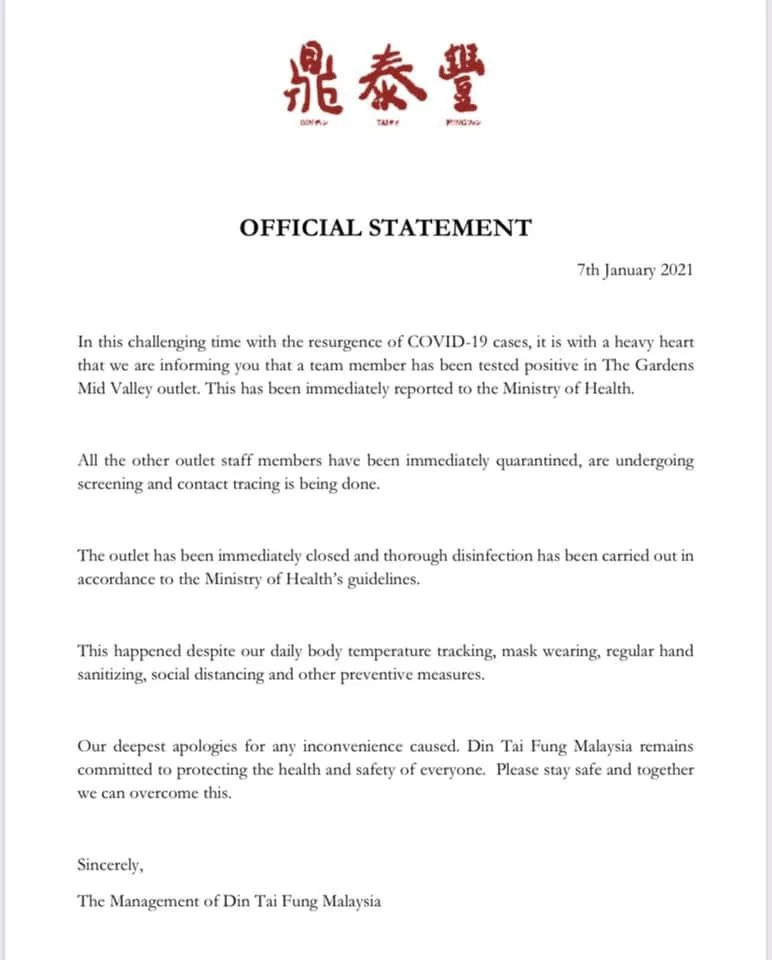 Late last night (Thursday, 7th January), Din Tai Fung Malaysia released an official statement that a team member from The Gardens Mall- Mid Valley Megamall branch had tested positive for Covid-19. Staff members working at the restaurant have since been asked to immediately quarantine at home.